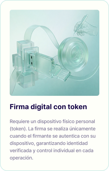 Requiere un dispositivo físico personal (token). La firma se realiza únicamente cuando el firmante se autentica con su dispositivo, garantizando identidad verificada y control individual en cada operación.